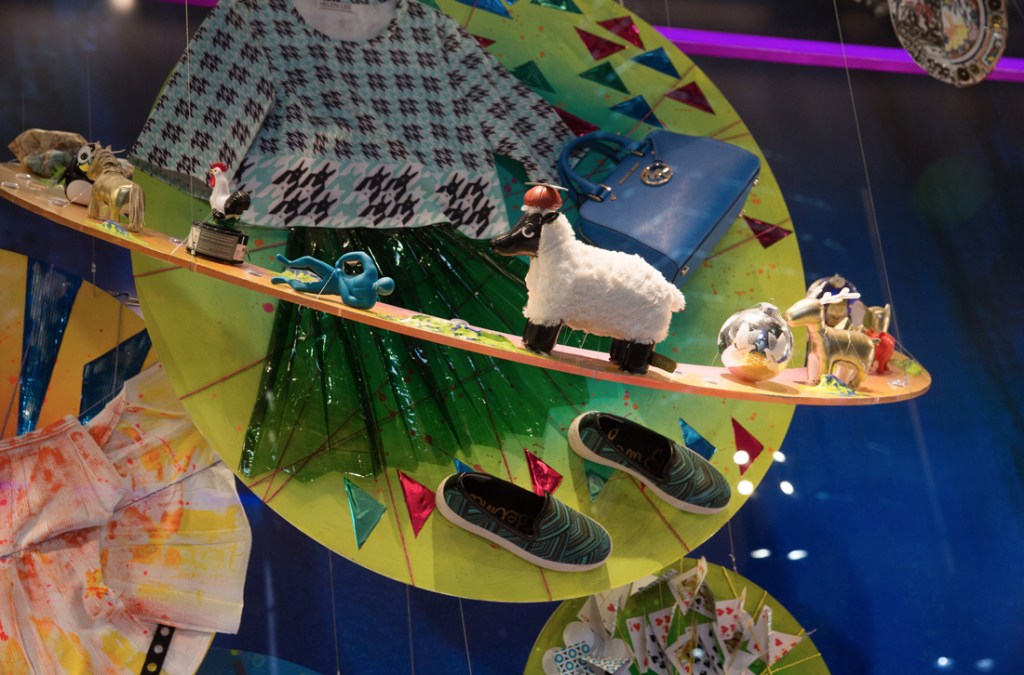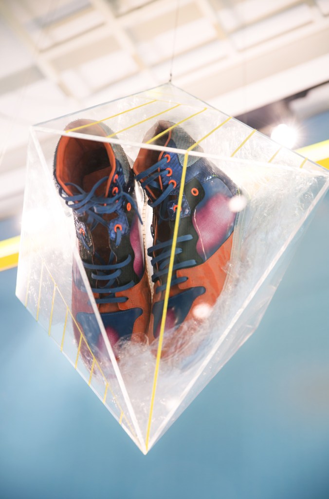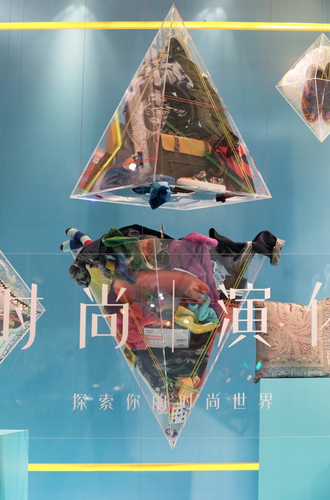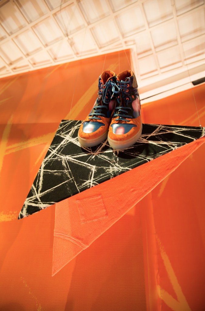 Inspired by Alexander Calder’s three-dimensional line drawings, this installation uses Lane Crawford products, including shoes, sweaters, and hoodies, to express the elegance and beauty of visual balance within triangular shapes.