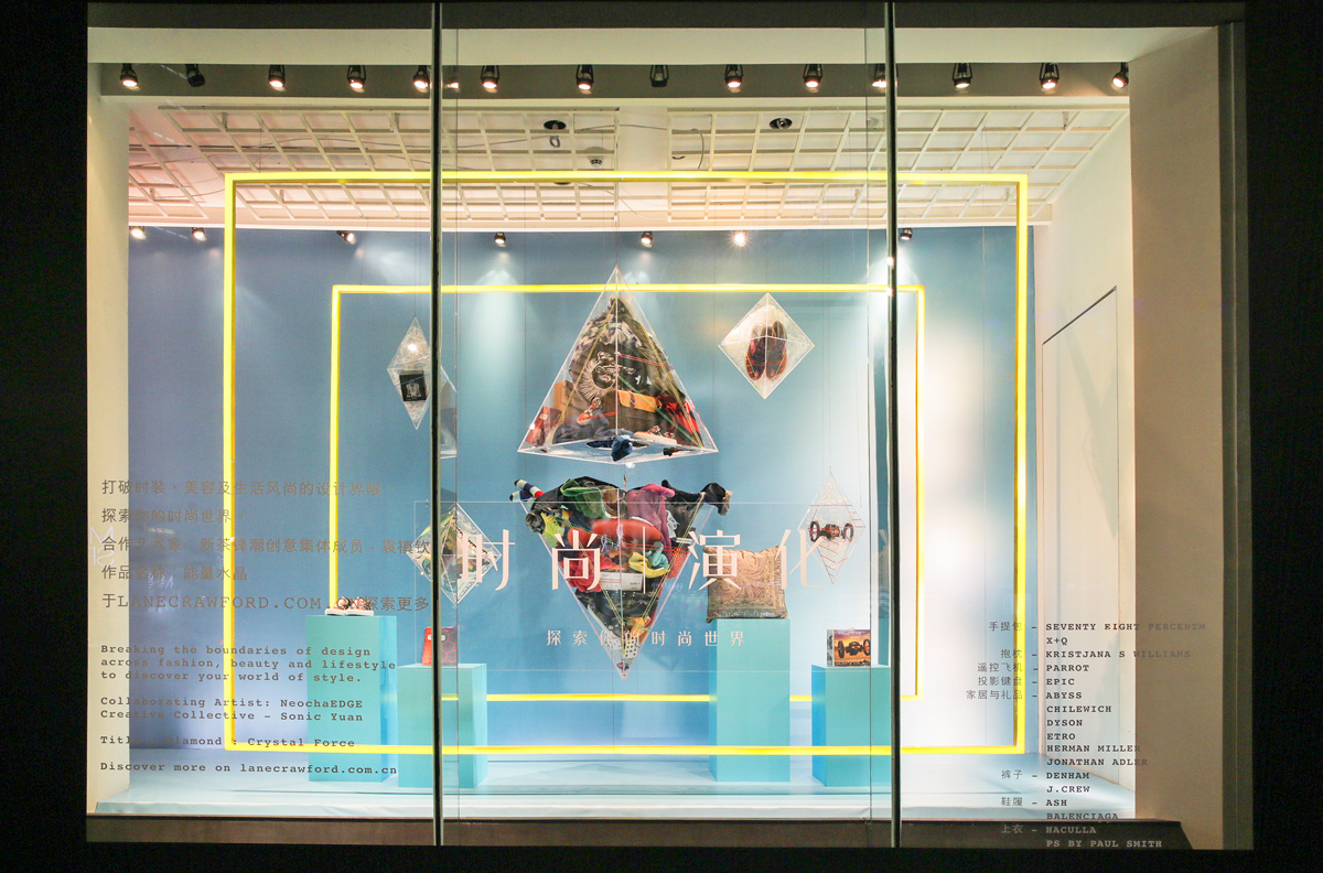 This installation uses a crystal diamond shape to display an assorted selection of Lane Crawford products. These elements are shown emerging from the diamonds in the style of a chemical reaction.